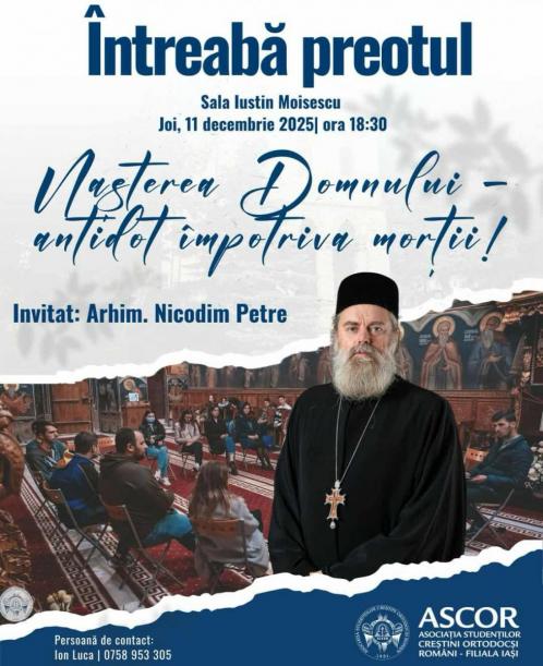 În Sala „Iustin Moisescu” din incinta Ansamblului Mitropolitan Iași, de la ora 18.30, va avea loc evenimentul „Întreabă preotul”, organizat de ASCOR Iași. Invitatul serii va fi părintele arhimandrit Nicodim Petre, consilierul Sectorului de Misiune, Statistică și Prognoză Pastorală al Arhiepiscopiei Iașilor și starețul Mănăstirii Bucium din Iași, care va vorbi pe tema: „Nașterea Domnului – antidot împotriva morții!”.